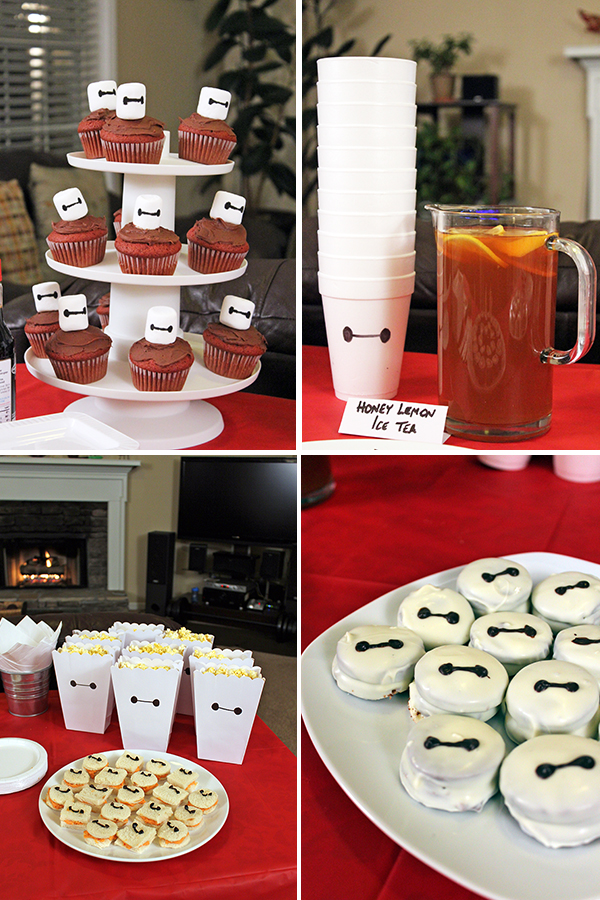 Para esta ocasión hice las tradicionales cabritas (pop corn) las cuales puse en un paquete de cartón que pinté con la cara de Baymax. También hice unos exquisitos alfajores cubiertos con chocolate blanco para luego también dibujar la cara de Baymax. Como refresco y en honor a una simpática integrante del grupo de los 6 Grandes Héroes (Honey Lemon), es que hice Té con miel y limón. Además de un rico helado del mismo sabor. Otra cosa que a los niños les encantó fueron unos Red Velvet cupcakes que decoré con un marshmallow en cada uno y pinté con un lápiz especial de repostería. Y también hice unos mini sandwich de pollo pimentón, decorado con aceitunas.