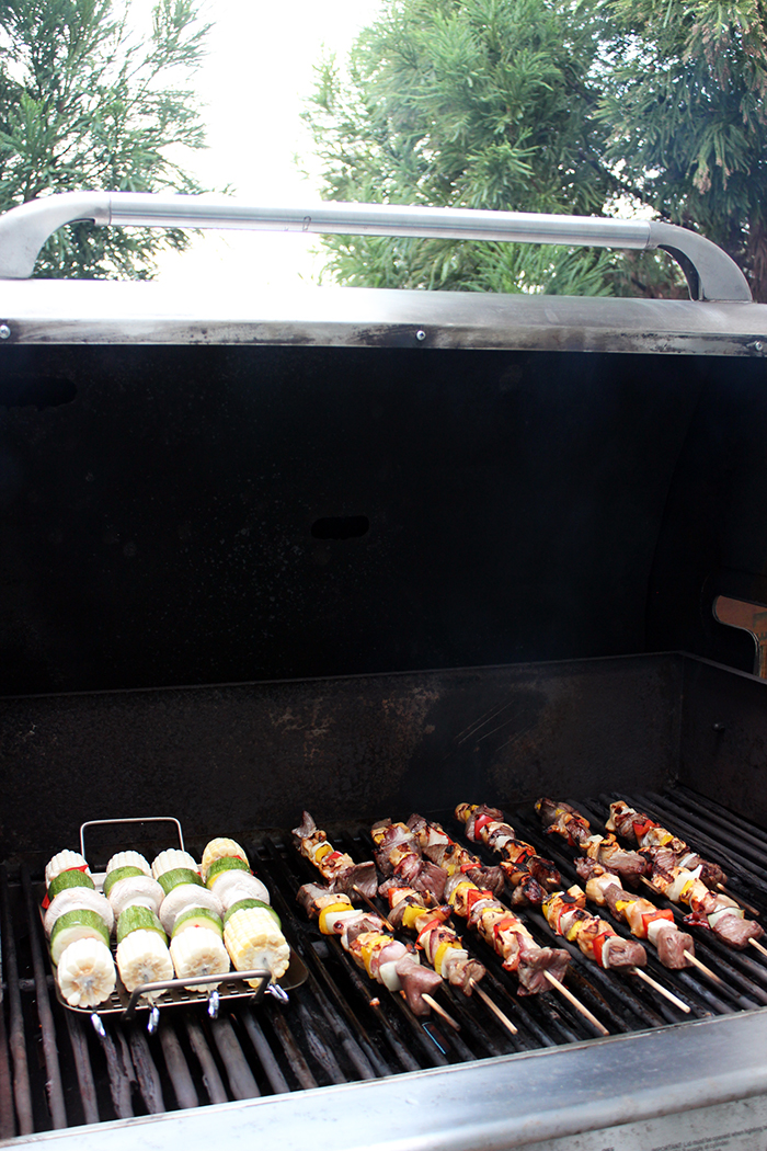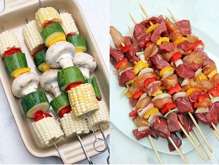 Ir colocando cada ingrediente en los palos de brochetas en el orden que sea su gusto. Pueden rociar con aceite en spray, además de colocar un poco de sal antes de llevarlo a la parrilla. Una vez listas las brochetas, servirlo con Green Onion Dip de Kraft.
