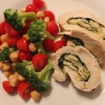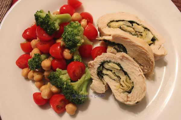 Filete de pollo relleno con espinaca, alcachofa y queso, más ensalada de brocoli, tomate y garbanzos