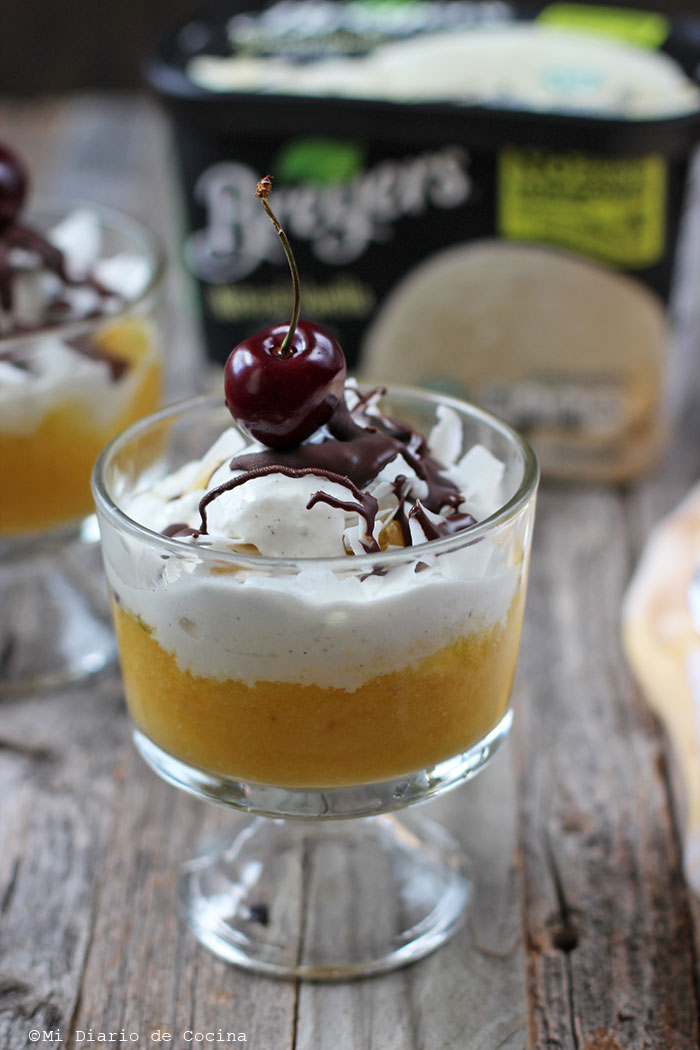 - En un vaso colocar un poco de piña molida luego cucharadas de helado de Breyers® Natural Vanilla Ice Cream , trozos de piña, la ralladura de limón, coco rallado o en lÔminas, un poco mÔs de helado. AdemÔs de el chocolate derretido para finalizar con una cereza encima. Sirve inmediatamente.
