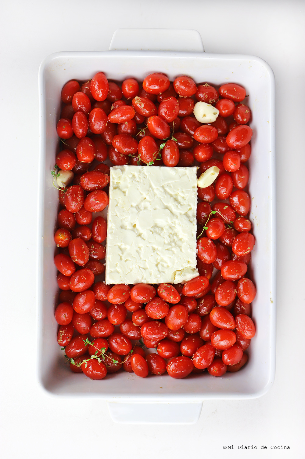 - Haga un espacio en el centro de los tomates y agregue el bloque de queso feta.