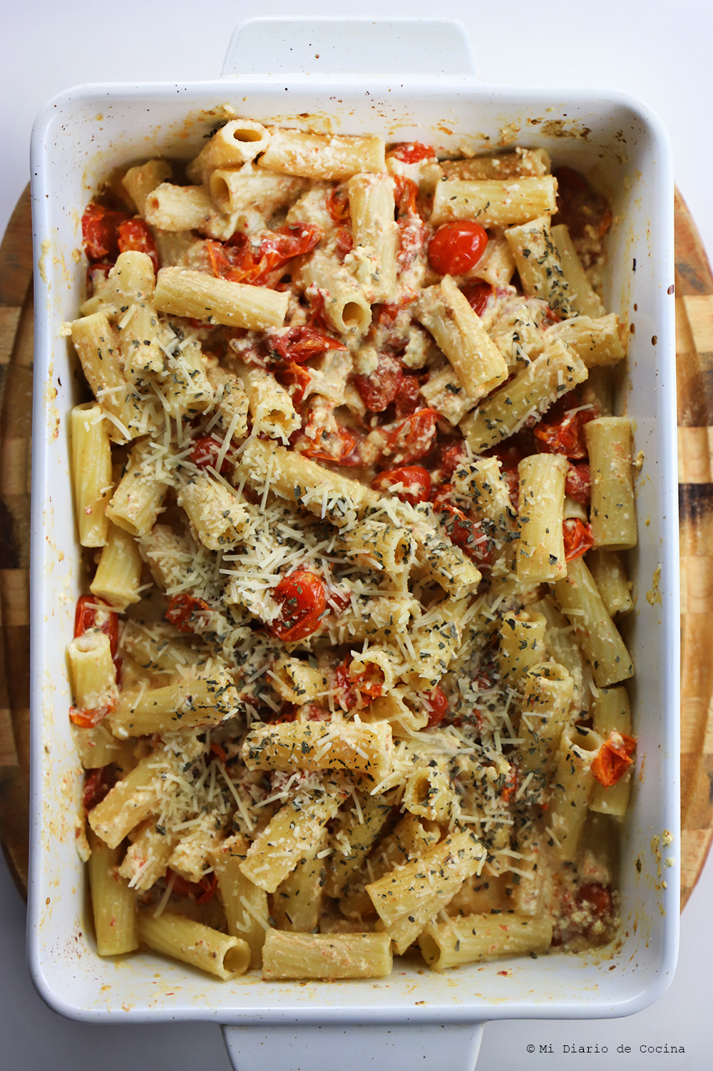 Pasta con queso feta y tomates al horno