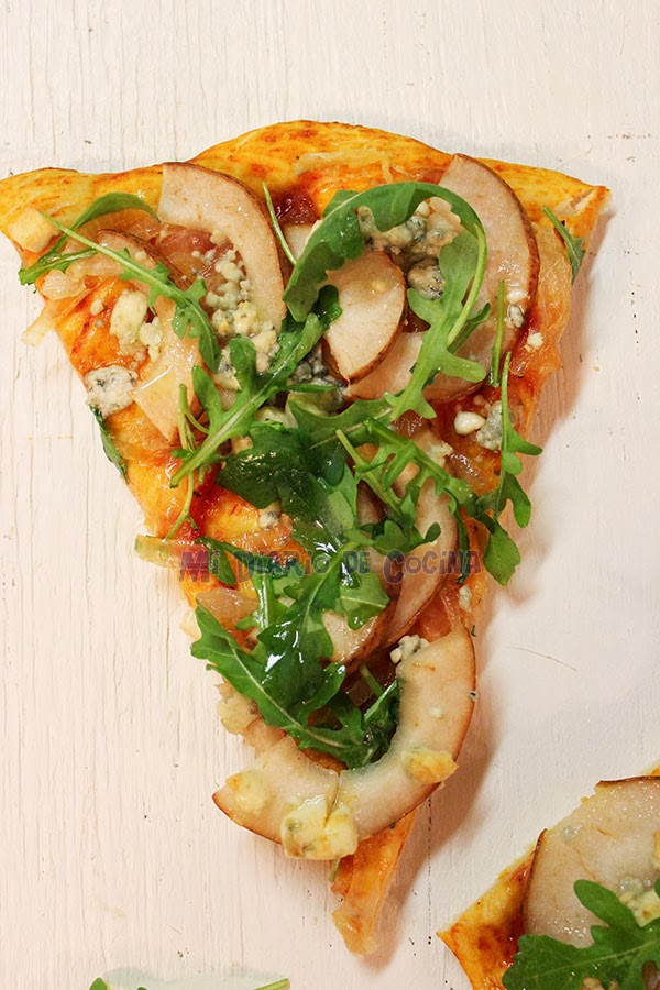 Pizza de cebolla caramelizada, peras, queso azul y rúcula01