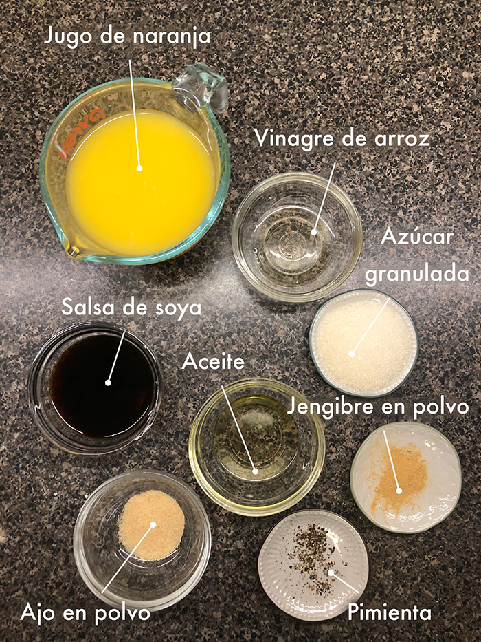Los ingredientes para el pollo, son los que le brindarรก sabor y color.