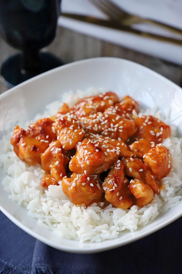 - Servir el pollo con salsa de naranja con semillas de sรฉsamo encima si gustan, acompaรฑado con arroz blanco.