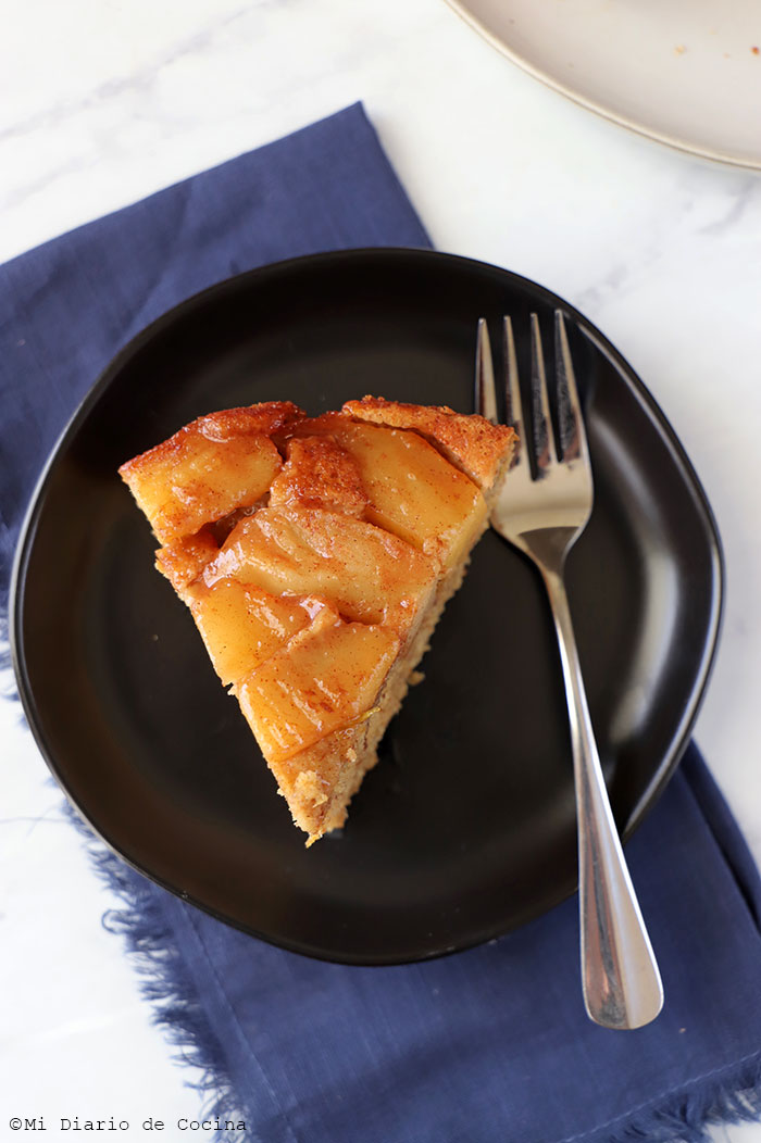 Supongo que hay que voltear la torta para que las manzanas queden hacia arriba. La receta no lo indica. En Argentina la llamamos torta invertida de manzana.