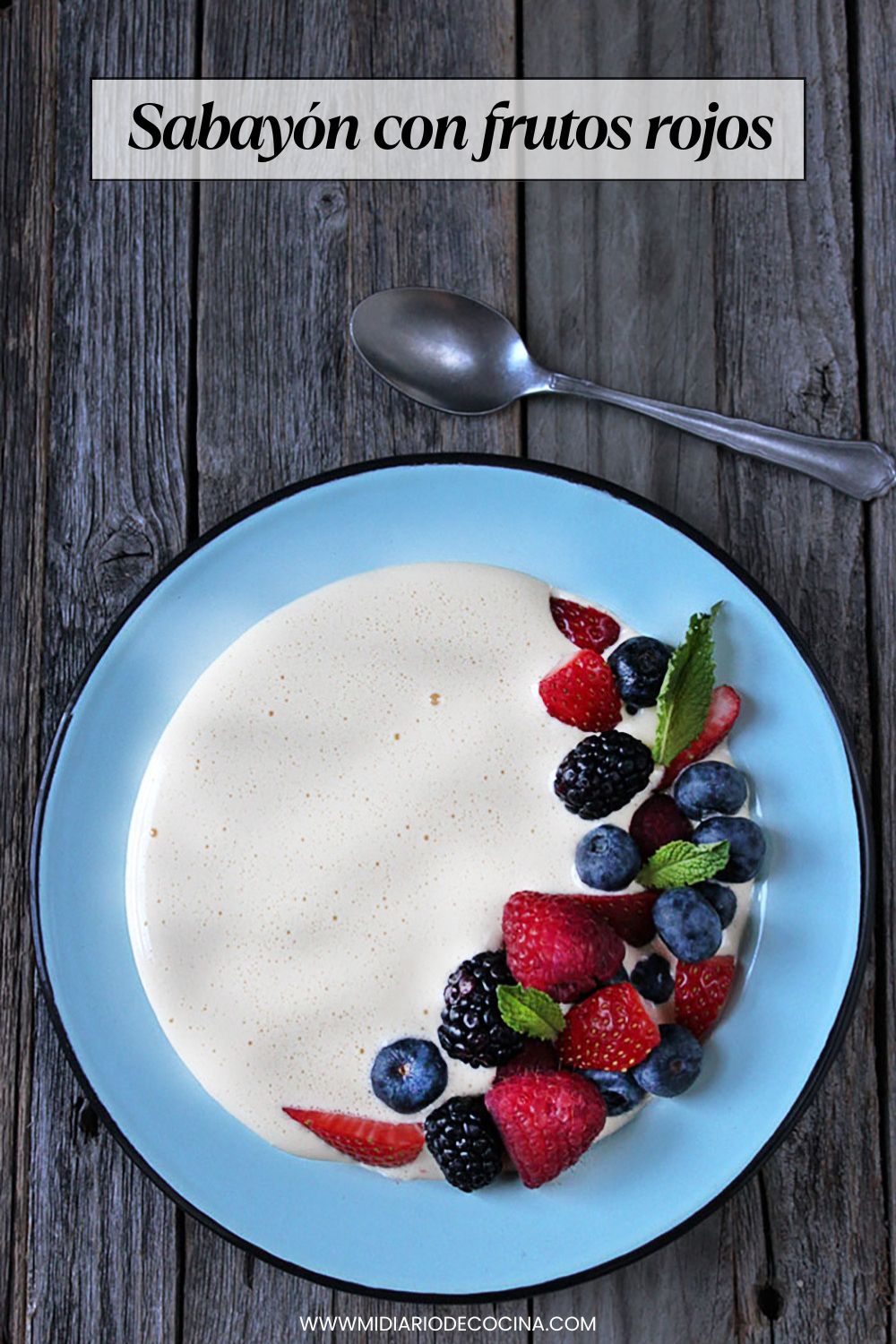 En un plato hondo o ligeramente curvado, coloca una porción generosa de sabayón. A un costado, dispón los frutos rojos frescos. Puedes terminar con hojas de menta o un toque de azúcar flor (impalpable).