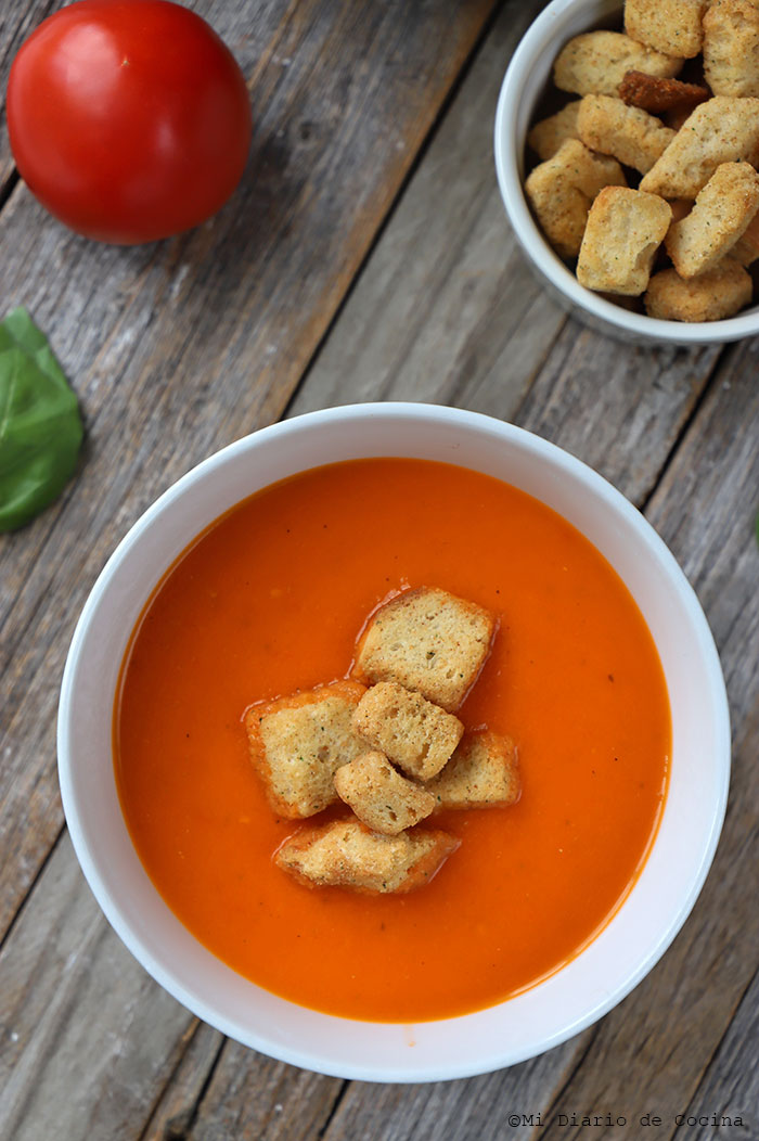 Hay un detalle no menor al momento de servir esta sopa de tomates y es acompañarla de croutones, le da el toque perfecto y en caso que no tenga croutones, puede simplemente acompañarlo de una torreja de pan tostado.
