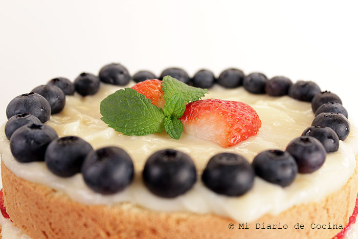 - Una vez listo, cubrir solo por arriba con crema pastelera, decorar con arándanos y hojas de menta.